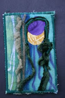 Finally took a photograph of this quilt that I tried some new techniques to achieve. I discharged some black fabric with fern fronds laying on the cloth as I misted it with a solution of 50/50 clorox and water. After processing it to stop the bleach, I did some rubbings of the fern fronds with the shiva sticks. I continued this technique on the hand dyed bluegreen fabric. After constructing the quilt, I decided to add some copper sheeting that I changed the patina by soaking it in ammonia. I cut the metal to make a fern frond and sewed it on the quilt with my machine. I used pieces of the left over copper to form into cylinders that I had hand sewed on.